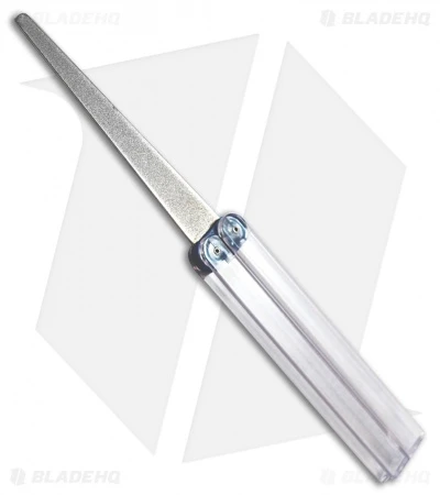The DMT Dia-Fold Flat File Sharpener is 5.25″ and made of clear composition handle which folds around sharpening file for convenient storage. Coarse grit file measures .75″ at base and tapers to .25″. Single sided diamond surface flat file is perfect for confined, narrow applications in the home, shop or garden.