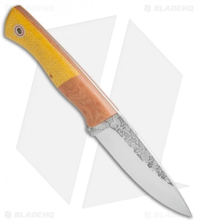 Fiddleback Forge’s Hunter fixed blade is a delight in the outdoors with its great size and comfortable shape. This model features natural Micarta bolsters and Philellow Burlap scales over natural Micarta liners. Its O1 steel blade is convex ground with a tapered full-tang. Sheath not included.