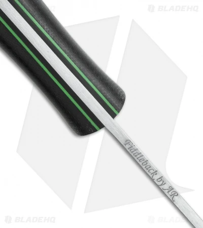 The Kephart fixed blade is based on the popular American knife pattern used by Horace Kephart, an early 20th century outdoorsman. Fiddleback Forge has added some great curves to the knife while maintaining the traditional spear point blade profile. This Kephart has a black canvas Micarta bolstered Box Elder wood handle with black liners and lime pinstripes. The solid full-tang blade is O1 tool steel. Sheath not included.