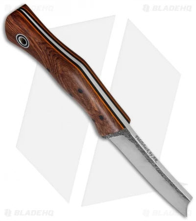 The Rebel fixed blade offers solid performance with a custom handmade design from Fiddleback Forge knives. This model has a rosewood burl handle with black and orange liners and an A2 steel blade. Fiddleback Forge fixed blades are a real treat for those looking to acquire a premium handmade knife with an emphasis on comfort in hand, efficient blade dynamics, and a traditional style. Fiddleback Forge has made a name by crafting knives that look and feel great.