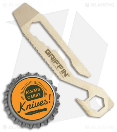 The Griffin Pocket Tool offers a slim EDC design with 11 essential utility tools. This sleek pocket accessory combines a screwdriver, prybar, bottle opener, scoring tool and several wrench sizes into a compact, self-contained tool kit. A deep carry pocket clip allows for comfortable pocket carry without adding to the bulk in your pockets. This Griffin Pocket Tool is made from solid brass in a satin finish.