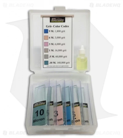 This boxed set from KME Sharpeners features 6 tempered glass blanks and 5 strips each of all 6 grits in a 5-1/4″ x 5-1/4″ x 2″ storage box. Included is a bottle of honing oil and a laminated instruction card with a grit color code. These diamond lapping films are an excellent way to achieve mirror polished bevels and take your blade sharpness to the next level.