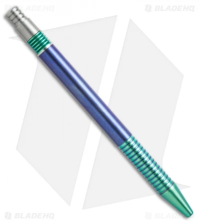 The handcrafted Matthew Martin 375 Series Tactical Click Pen showcases an all titanium body with a titanium clip and tip. This custom model has a unique blue and green anodized finish. The pen uses a German-made nickel-plated click mechanism. A pure delight to behold and use.