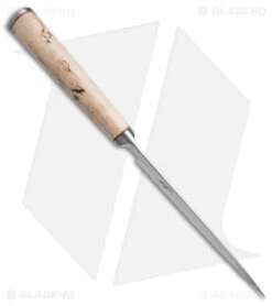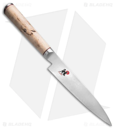 The blade is made from 101 layers of steel, ice-hardened to perfection and forged into a Damascus pattern. The handle is made of wood from the Karelian birch, the only wood ever used for a Faberge egg. The Miyabi Birchwood SG2 6″ Utility Knife is an elegant and tough kitchen tool!