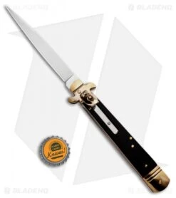 This 9.75″ Slimline Stiletto from SKM comes in the Leverlock style with a black wood handle and a satin finished spear point blade. Gold-colored bolsters add a classic element to the design. SKM specializes in collectible Italian style stilettos made with traditional knife-making techniques. Add classic Italian style to your collection with the SKM Leverlock stiletto.