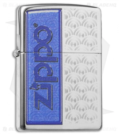 This authentic refillable Zippo lighter features a high polish chrome body with a swirl pattern and blue Zippo logo.